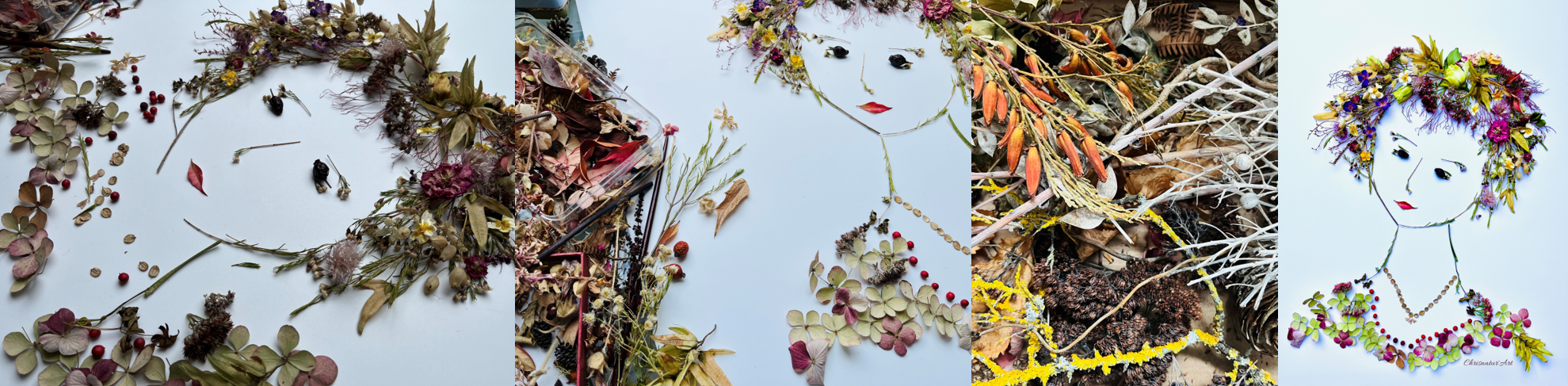 C'est en observant les feuilles d'automne aux couleurs chatoyantes, les brindilles résistant au froid de l'hiver, les fleurs printanières aux couleurs vives et les herbes folles estivales qu'est venue l'envie de les collecter et les mettre en scène.